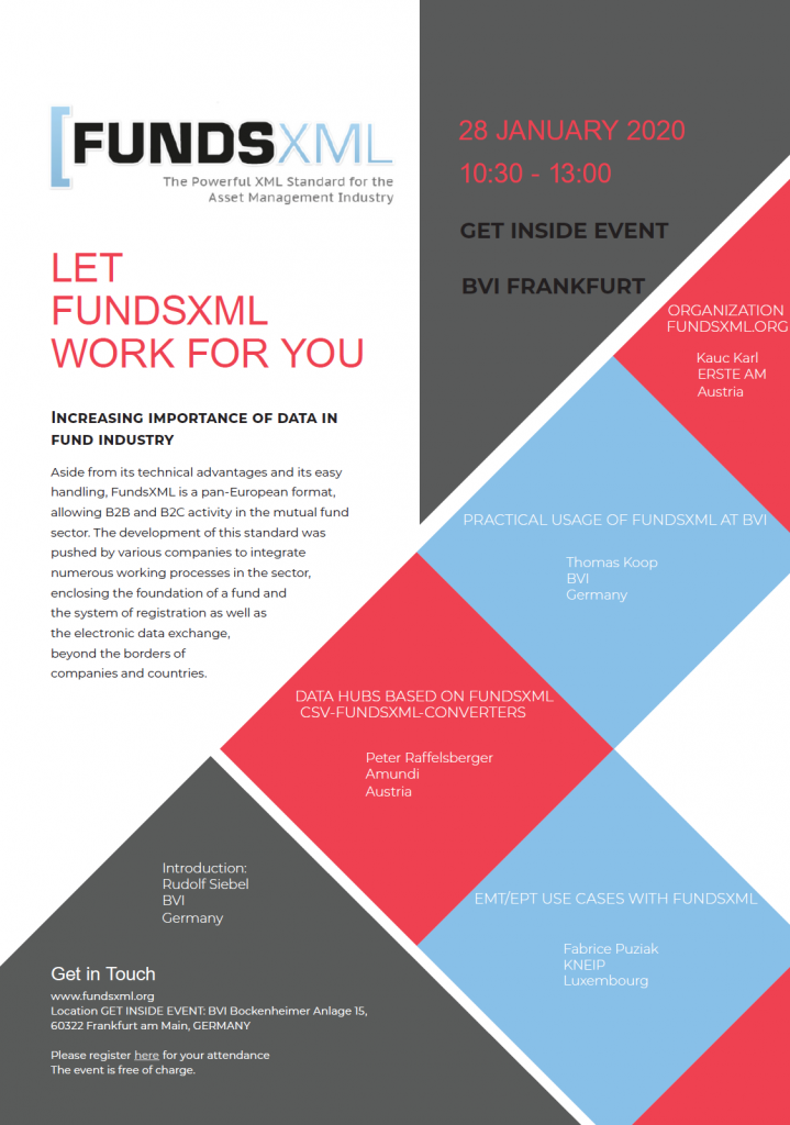 For the first time, the FundsXML initiative organized a FundsXML Get Inside Event on the premises of BVI in Frankfurt am Main. The keynote speaker was Rudolf Siebel the Managing Director of the BVI, who vehemently advocated the crucial role of the standardized FundsXML format for exchanging funds data information within Europe. Once more, the FundsXML initiative was able to present well-known speakers, which had a lively exchange with the audience of around 65 interested persons. The selected speakers consisted of Karl Kauc (Erste Asset Management), Thomas Koop (BVI), Peter Raffelsberger (Amundi Austria) and Fabrice Puziak (KNEIP).